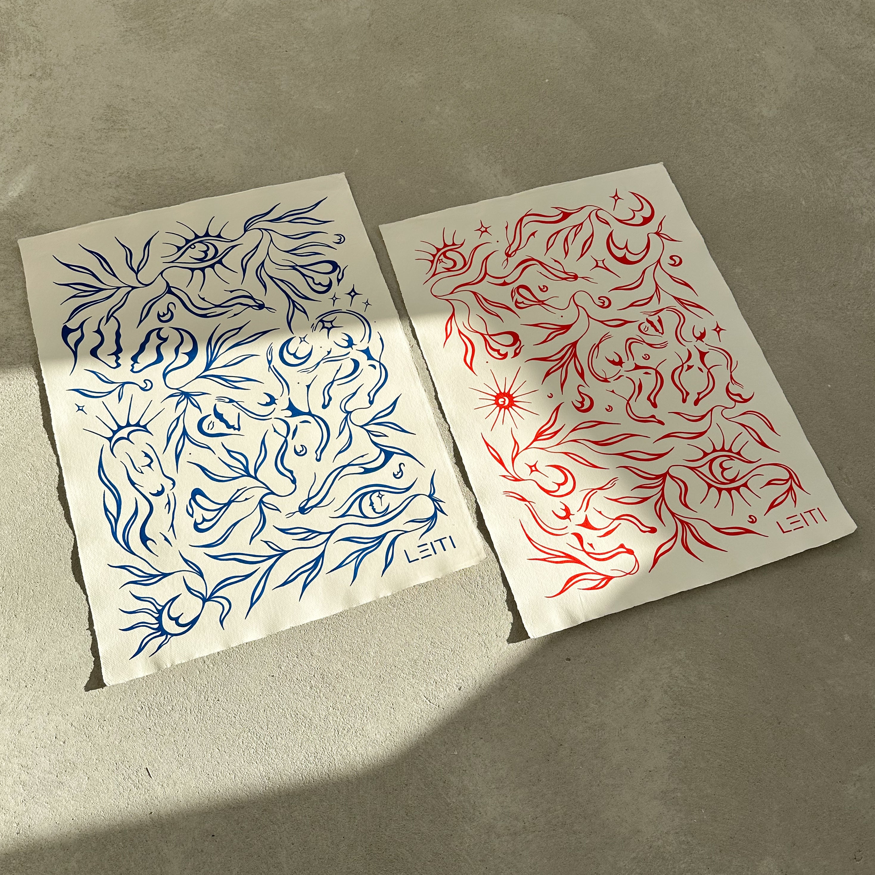 These two striking paperworks by LΞITI showcase a minimalist approach, created with acrylic pen on paper. One piece is dominated by bold red tones, while the other features deep, calming blue hues. Both works emphasize the reduction of forms to their essential elements, inviting viewers to explore the harmony and balance within simplicity. The deliberate use of color and form highlights the artist's ability to communicate profound emotions through minimalist expression.